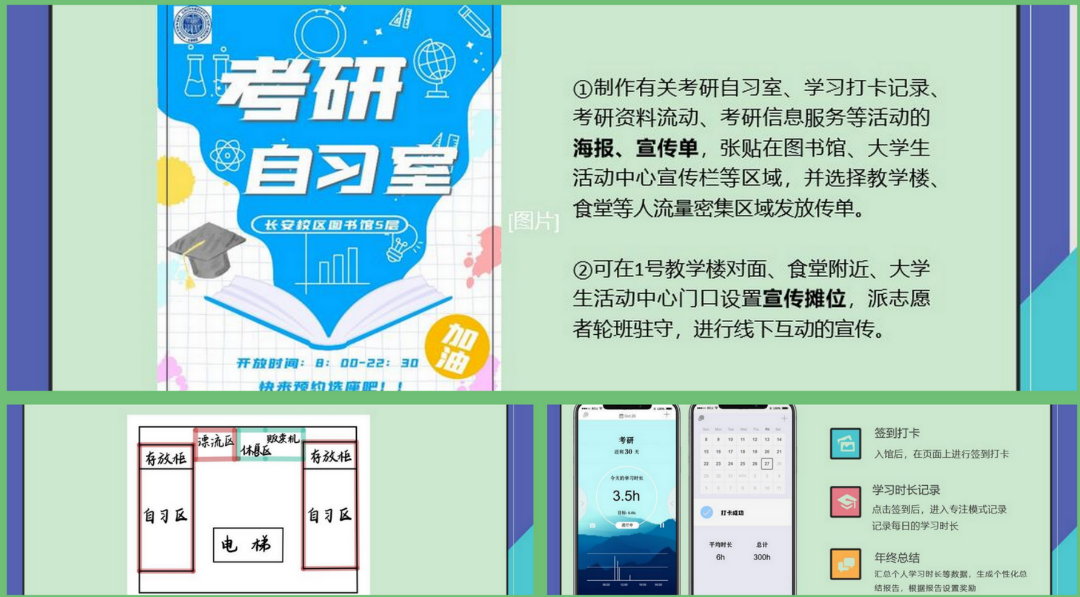 《乘风好去,考研顺利》项目基于用户调研分析、其他高校考研自习室案例考察,项目提出由图书馆提供线上线下考研自习室服务,线下设立单独的自习室,进行考研资料公益漂流,并配备自动贩卖机、休息区、物品存放柜提供图书馆服务;线上进行座位预约、学习打卡、运动打卡、心理咨询通道等服务,助力学子“乘风好去,长空万里,直下看山河!”