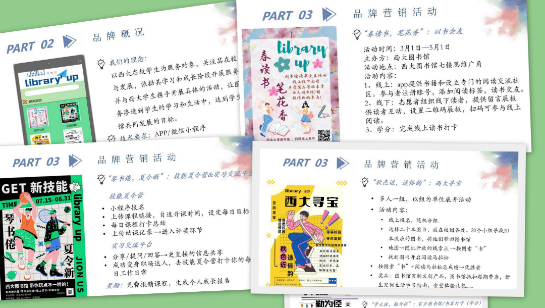 在《Library UP》(Students Grow Up with NWU Library)项目中,从秋季到夏季,以季节为标志设计相关活动:新生入学,参加秋季西大寻宝、心灵空间活动;冬季参与期末交流吧、打卡家乡图书馆/书店活动;春季更有阅读交友活动;夏季则推出技能夏令营、实习交流平台。活动形式多样,线上小程序与通识课程设置并行,让图书馆陪伴学子的四季!
