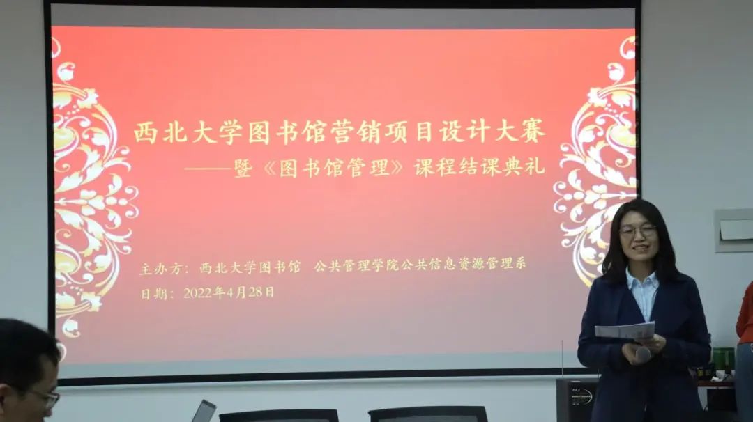 “五一”劳动节前夕,565net必赢公共信息资源管理系与西北大学图书馆于2022年4月28日在图书馆联合举办图书馆营销设计课堂创新竞赛。此次活动是公共信息资源管理系课堂教学创新举措之一——将《图书馆管理》专业课程的结课和考核形式从传统的教室课堂转移到图书馆真实场所,由同学们分组汇报自己设计的图书馆营销方案,邀请图书馆馆员和专家共同现场评审同学们的结课作业方案汇报。