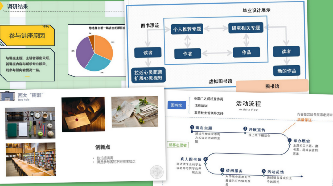 最后,《毕业季》项目中向毕业生及其他在校生,项目开展毕业生“最能代表大学时代的自己”的赠书漂流活动、毕业设计作品展览与相关书籍推荐活动、揭示毕业生学术活动的线上虚拟图书馆建设活动。通过这些活动,促进学生良好阅读习惯和自我思考能力的培养,打破刻板印象,把图书馆打造成为交流、甚至美好回忆保存与分享的场所。