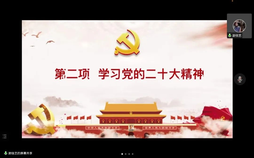 首先,尉佳艺同志领学党的二十大主要会议精神。她强调,要深刻把握全面建成社会主义现代化强国总的战略安排和未来五年的主要目标任务,牢牢把握“坚持和加强党的全面领导”“坚持中国特色社会主义道路”“坚持以人民为中心的发展思想”“坚持深化改革开放”“坚持发扬斗争精神”的重大原则,埋头苦干、担当作为,不断推进社会主义现代化建设。