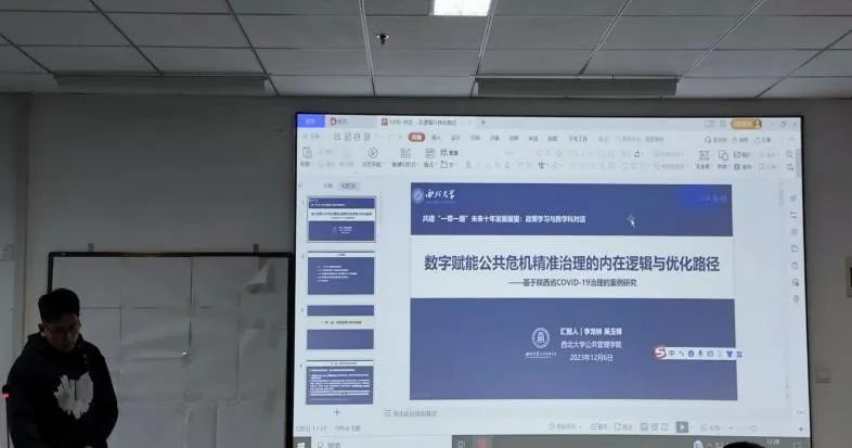 李龙林硕士研究生的研讨主题为《“一带一路”背景下数字赋能,公共危机精准治理的内在逻辑与优化路径》,主要包括“一带一路”政策背景与研究回顾、公共危机精准治理:危机治理现代化的重要面向、数字赋能公共危机金融治理:以陕西省COVID-19治理为例以及数字赋能公共危机精准治理的优化路径四个部分。通过对案例价值赋能、行动赋能、技术赋能、结构赋能四个方面的分析总结得出政策启示:首先以精准治理引领公共危机治理;其次以虚拟表达促进公众参与行动;同时以精准技术提升应急管理技术,最后以精细结构共建整体自制模式。