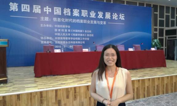 2015年5月29日-6月1日,由中国档案学会、《档案学通讯》杂志社、《中国档案》杂志社主办的“第四届中国档案职业发展论坛”在银川市隆重举行,我院青年教师李姗姗参会且荣获优秀论文奖。此次会议由中国档案学会方鸣秘书长主持并演讲,国家档案局巡视员华丹致欢迎辞,中国高等教育学会档案工作分会理事长柯友良以及中国人民大学教授、《档案学通讯》总编辑胡鸿杰发表演讲。